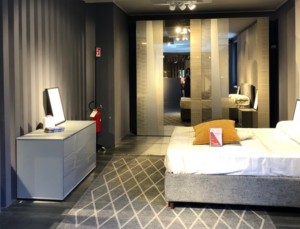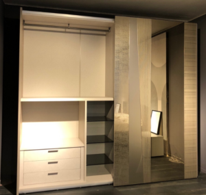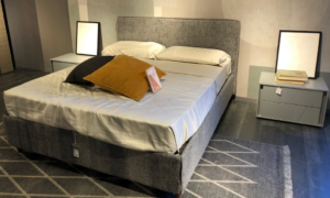 Camera da letto  Tomasella completa di comò e comodini Kross, un letto salvaspazio imbottito e contenitore, armadio scorrevole modello Madras con ante in vetro.
