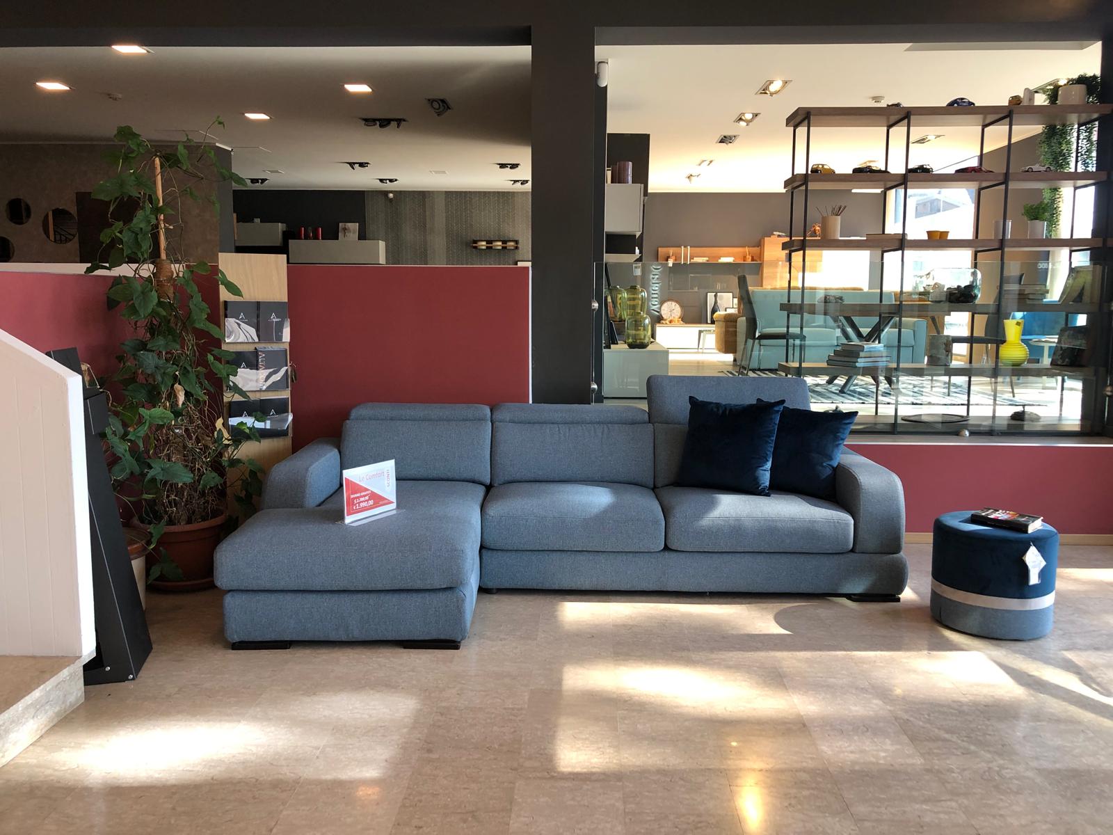 Divano modello Graffiti ditta Le Comfort in tessuto blu con due slide manuali ed una chaise longue, completo di poggiatesta reclinabile. L293xP100/170 €1.990 incluso