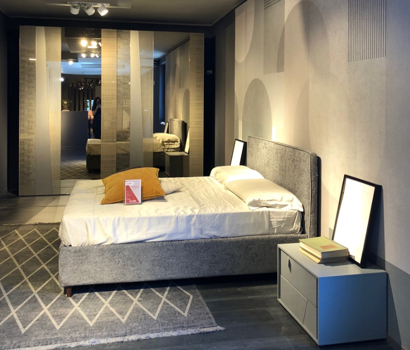 Camera da letto Tomasella completa di comò e comodini Kross, un letto salvaspazio imbottito e contenitore, armadio scorrevole modello Madras con ante in vetro. Comodini