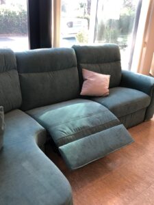 Divano modello Valencia di Rosini divani in tessuto idrorepellente verde con due relax elettrici e chaise lounge.